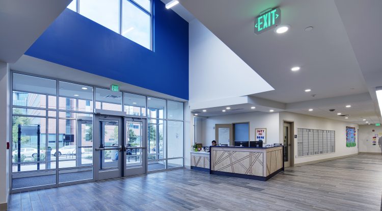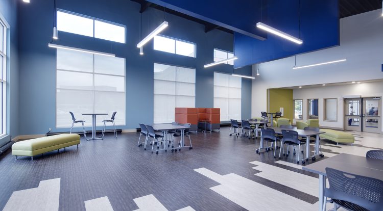 Focusing on the complete student experience, the undergraduate building also includes a large, 2,775-SF multi-function “connect” space. Other amenities in both buildings include common kitchens, lounges, laundry, and study areas. Finishes are typical of an institutional dormitory building utilizing a mix of carpet tile and ceramic tile flooring in the dorm units.