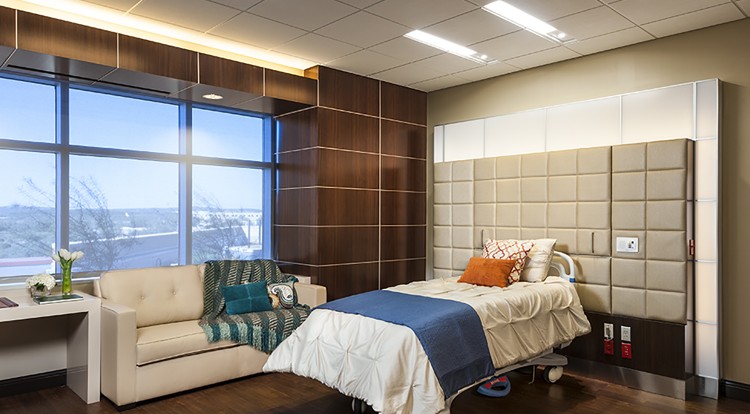 Forest Park Medical Center San Antonio is a specialty surgical hospital and medical office building at the heart of a master planned, mixed-use campus. The facilities have a hospitality-oriented focus to patient care and amenity offerings. A full-service acute care hospital, the 154,000 square foot Forest Park Medical Center features 54 beds (including 16 VIP patient suites), 12 operating rooms, and two procedure rooms. The hospital includes state-of-the-art diagnostic imaging suites, laboratories, a pharmacy and a spacious cafeteria. Inspired by four and five-star resorts, the medical center incorporates an upscale ambiance throughout, which extends to the large dining facility offering chef-prepared foods, a coffee bar, and peaceful outdoor spaces, including self-sustaining green roof systems. Medical support technology, including patient monitoring devices and intravenous connection systems, are integrated into an attractive upholstered headboard and hidden when not in use. For additional privacy, VIP suites feature a separate room for family and guests equipped with a kitchenette, entertainment options and a sleeping area. Immediately adjacent to the hospital is a four story, 84,000 square foot medical office building and a four level, 470 car parking garage.