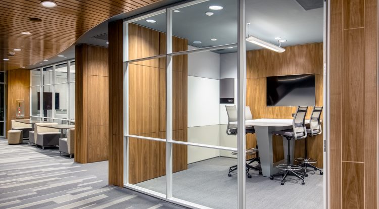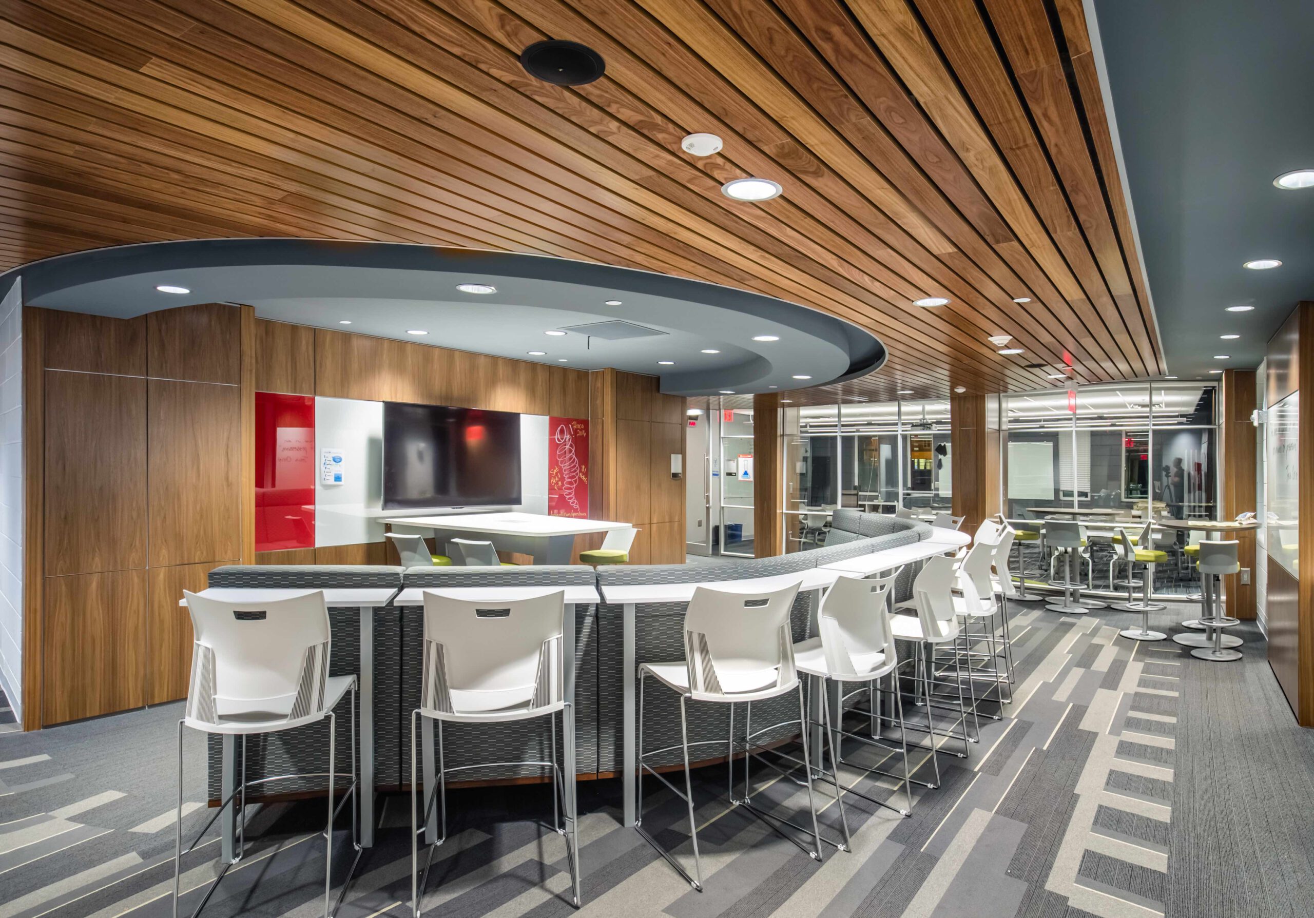 The renovation encourages employee collaboration and engagement. Breakaway rooms made for small conferences include full monitors and backlit LED lighting lining the wall, facilitating mobile conferencing. Comfortable seating plus full internet capabilities allow for a shared work environment in the mobile lounge. Nearly 80% of the sheetrock in the office is covered with writable wall surfaces, enhancing employee teamwork. Scheduling monitors are installed outside all rooms with meeting capabilities to eliminate any scheduling complications. Wellness rooms provide a place for relaxation and healing for new and expectant mothers or employees feeling under the weather.