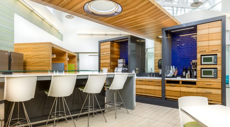 In the six breakrooms throughout the corporate office, Italian porcelain tile backsplash plus custom millwork panels evoke the modern atmosphere felt throughout the entire office. The renovation encourages employee collaboration and engagement. Breakaway rooms made for small conferences include full monitors and backlit LED lighting lining the wall, facilitating mobile conferencing. Comfortable seating plus full internet capabilities allow for a shared work environment in the mobile lounge. Nearly 80% of the sheetrock in the office is covered with writable wall surfaces, enhancing employee teamwork. Scheduling monitors are installed outside all rooms with meeting capabilities to eliminate any scheduling complications. Wellness rooms provide a place for relaxation and healing for new and expectant mothers or employees feeling under the weather.