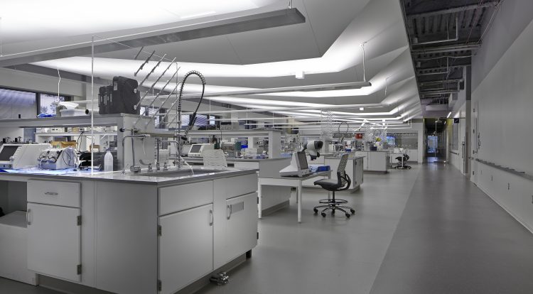 One of the largest and most unique areas in this multi-faceted project is the laboratory space. A see-through custom ducted, stainless steel fume hood is installed, allowing employees to view experiments occurring in the lab. As employees enter the lab, all of the printed vinyl decals on the full height glass doors showcase the patent numbers of all of Halyard’s products. Welded chemical resistant vinyl floors and multi-faceted millwork clouds hang above all lab islands, creating the look of a sail. These millwork clouds aid in both lighting and acoustics, absorbing sound created in the laboratory. Each lab island is equipped with epoxy resin tops, medical gases, and completely deionized water systems. Mock-up rooms allow customers to see all of the company’s products in motion, offering true-to-life and fully operational surgery rooms with surgical lighting and medical equipment.