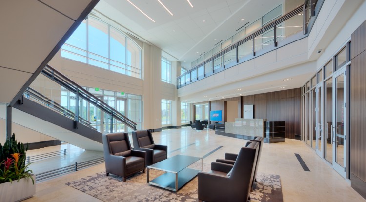 The lobby greets visitors with high-end finishes such as extensive granite and rich millwork, materials also used throughout the sixth floor lobby. Green Globe design parameters are utilized to ensure thoughtful sustainability practices. Site work includes 12-acres of grading and storm sewer installation. This area includes surface parking spaces and an outdoor patio, fountain, and bocce court.