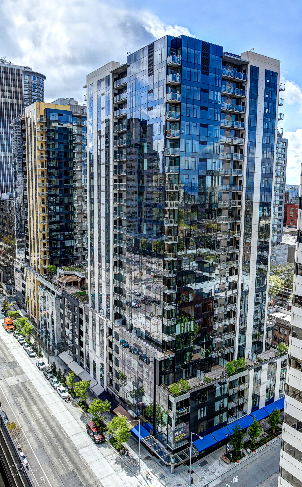 Lewis constructed two 24-story apartment towers in Seattle’s Belltown district. The 654 apartments are primarily one-bedrooms and studios, designed for high quality while remaining affordable to young professionals. Parking for 434 cars is provided in three levels below-grade. Additionally, 18,000 square feet of street level retail space includes a bike commuting center, a bike store and a combination restaurant/café/grocery for famed chef Tom Douglas.